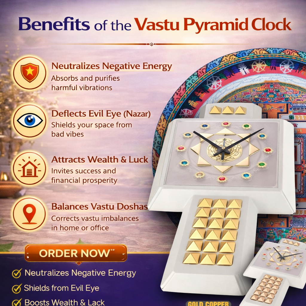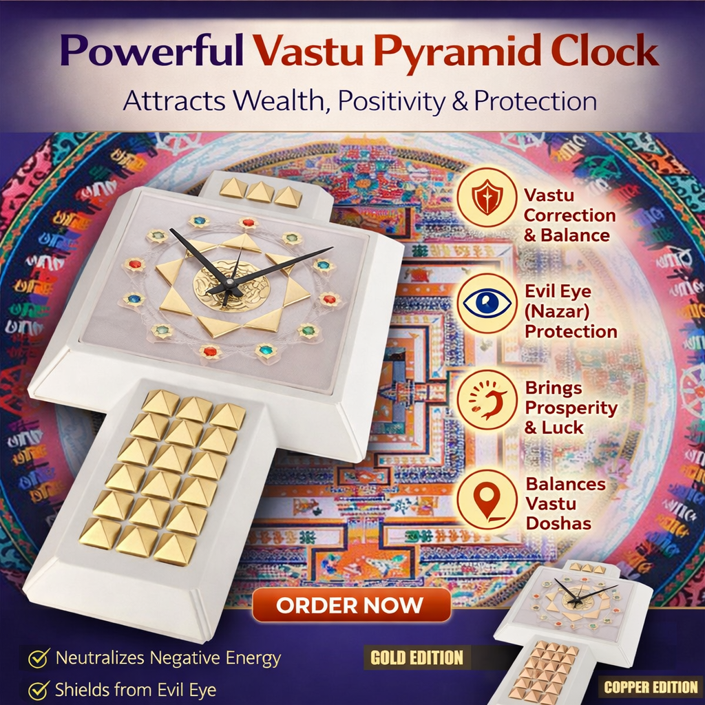 Upgrade your space with this unique Vastu Pyramid Wall Clock (Gold Edition), designed to combine functionality with powerful Vastu benefits. Featuring a beautifully crafted brass pyramid grid and sacred yantra design, this clock helps in balancing energy while keeping perfect time.